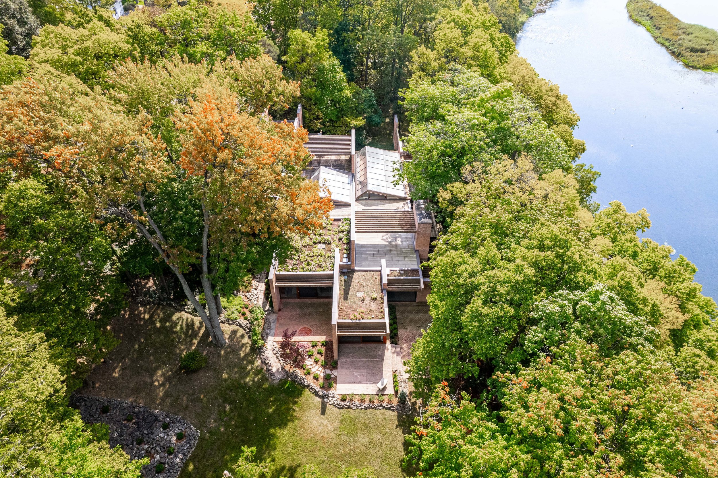 Crafted from enduring masonry and built into the natural contours of its 1.766-acre lot (1.34-acre combined with an adjacent 0.42-acre lot), Hilborn House is not merely sited on the land—it is embedded within it. The structure embraces the surrounding forest and river with a reverence usually reserved for temples. Expanses of glass dissolve the barriers between the indoors and outdoors, while mahogany-framed windows and doors offer warm, tactile counterpoints to the stone and brickwork.