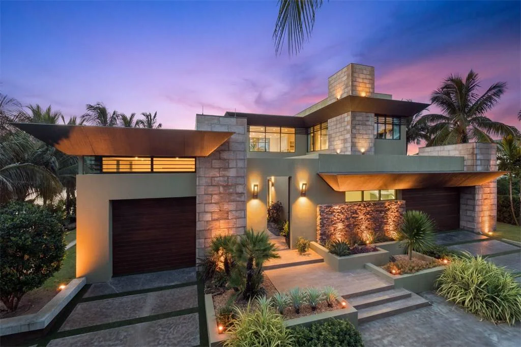 Additional Fallingwater inspiration can be found in this South Florida home. The pairing of considered exterior landscaping with an overall dedication to natural materials harkens back to Wright’s love of organic architecture. Warm wood softens the sharp angles that give this 2015 build a decidedly current feel, while the interiors offer all the expected amenities plus a two-story master enclave that features two private patios, an office, hot tub, and, in true Floridian fashion, a putting green.