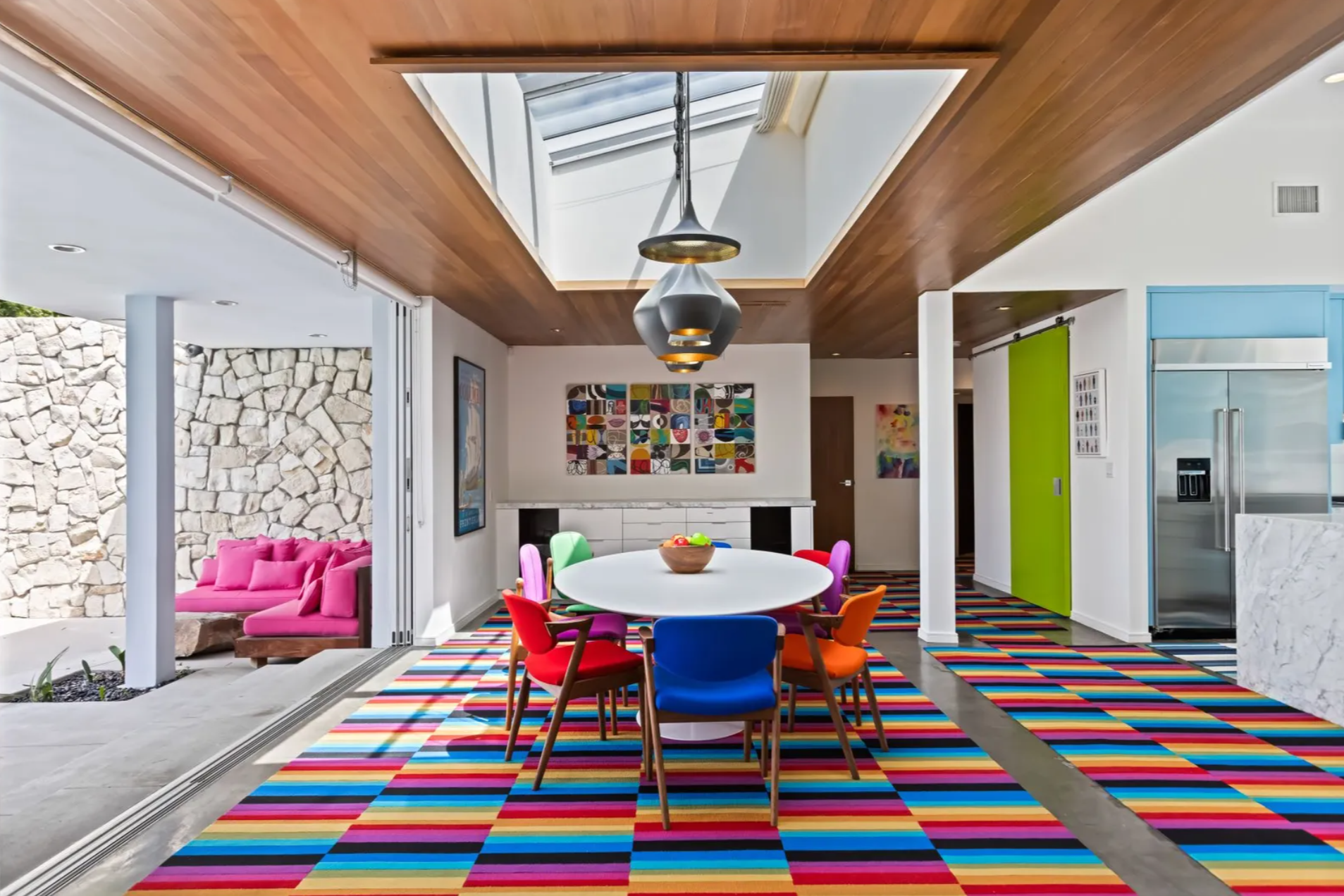 Surrounded by lush fruit trees and greenery at a prestigious address, this quintessential midcentury modern gem features a single-level floor plan, three bedrooms, and lovely views. Beneath a soaring skylight and artful pendant fixtures, the dining room is an airy, lofty space overlooking and opening through Fleetwood doors to the refreshing saltwater pool and a grilling area. Adjoining are a living room with a wood-burning stone fireplace wall and a kitchen with a Carrara marble–topped island, Miele and KitchenAid appliances, and whimsical blue cabinetry.