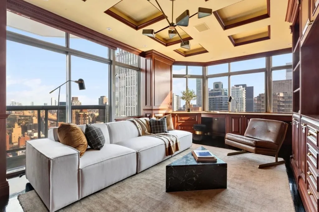 High above Lenox Hill, this six-bedroom duplex condominium is flooded with light and revels in stunning skyline, East River, and Central Park views. Highlights include an open-plan living room with plentiful windows, a formal dining room, an eat-in kitchen, a den, and a gym. A corner office with two exposures enjoys an impressive panorama of the city that never sleeps, while the library has numerous built-ins and another iconic view. Four wraparound balconies offer further opportunities for appreciating the vista.