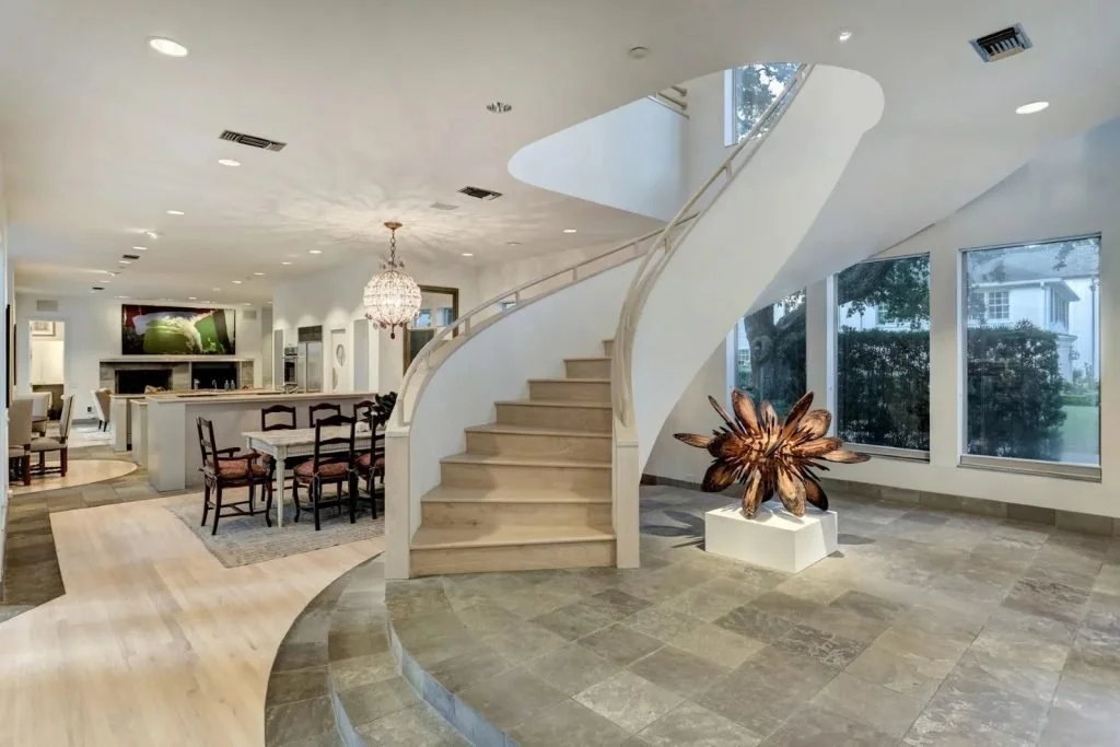The light-flooded interiors of this striking 5,297-square-foot contemporary in River Oaks offer stylish, lofty spaces for living and entertaining. A foyer with a stunning sculptural staircase flows openly to the formal living room, the dining area, and a kitchen with an island, a wet bar area, and a breakfast nook. Beyond are a family room and a library with floor-to-ceiling windows, bookshelves, and a reading loft. Covered outdoor sitting areas on two levels overlook the luxurious backyard, which includes a pool with a waterfall.