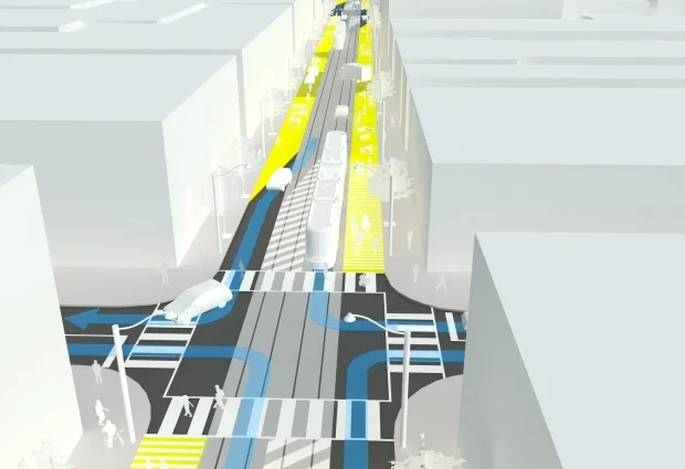 It also includes accessible curbside boarding for streetcars at all stops along the street, and dedicated streetcar lanes, though they won't be physically separated.