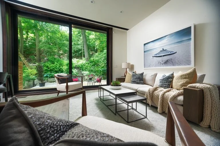 Be the first to live in a custom modern home crafted with a tradition of quality and detail. Own a lovingly built house with locally sourced stone and solid wood throughout. 10-foot floor-to-ceiling windows look out on to lush ravine lot. The patio has gas hook-up for the ultimate barbeque – perfect for Al Fresco dining. Each bedroom opens out to juliet balcony. The spacious den and office, windowed finished basement, abundant storage, skylight, and laundry on both upper and lower floors.