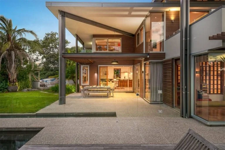 Award-winning architect Pete Bossley gave this incredible Auckland-adjacent home a well-deserved redesign, aligning it with the highest standards of comfort and eco-friendly luxury. The 13-meter solar-heated pool and easy harbor access for paddleboarding and boating will have each of the four bedrooms in the separate second home booked solid.