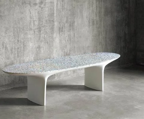 Fragments of plastic that washed up on beaches are being used to create eye-catching furniture, such as the Flotsam table.